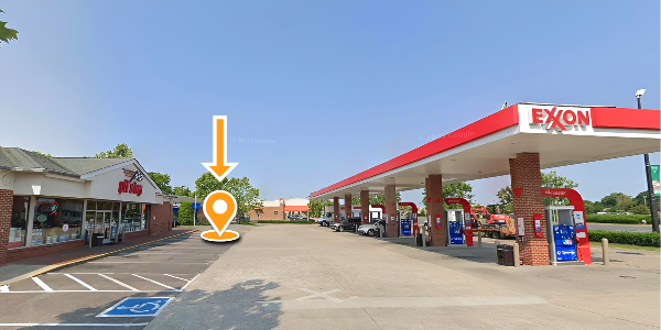 Board between Pit Stop Convenience Store and the Exxon Gas Station.
